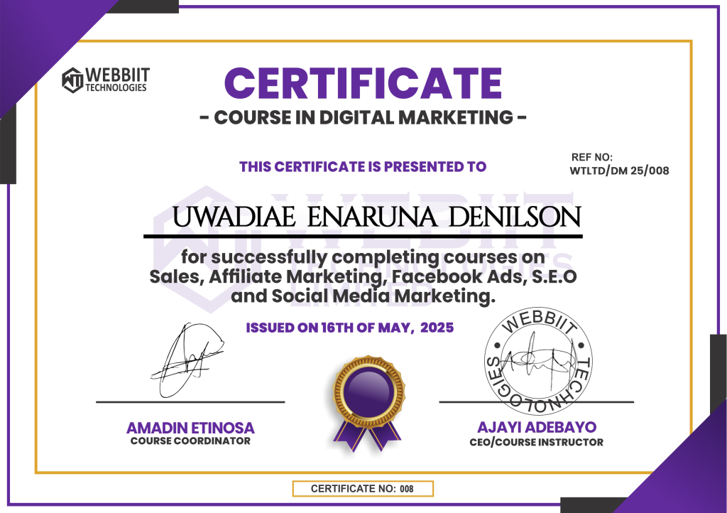 I founded my Tech/ICT, Webbiit Technologies, 8years ago 2013 – a technology innovation and media agency that has created and successfully launched several software products in Nigeria. I went ahead to start my Media Agency Webbiit Media in 2018 after recording so much success and financial shift through Digital Marketing and we now produce Nollywood movies. See some of my movies here
