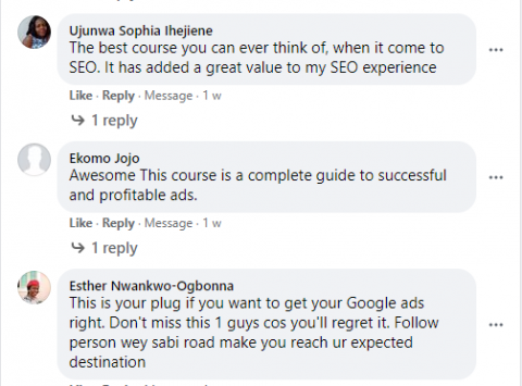 This training is specially designed for you if you are just starting out and want to be a digital marketing expert and for those digital experts & business owners who want to scale up their career and are facing trouble running successful campaigns and making as much as they need to but are currently not satisfied with their online income. This course is easy to understand with practical knowledge, live projects, already done for you Website Templates, Ads Copy, Ads Images and all that you need to succeed. For those who need offline training, we provide FREE ACOMODATION Two Months One on One Practical Training in our Training center located in Benin City, Edo State.